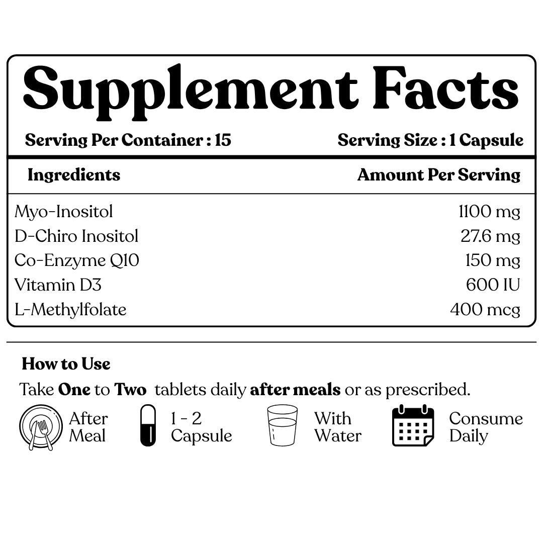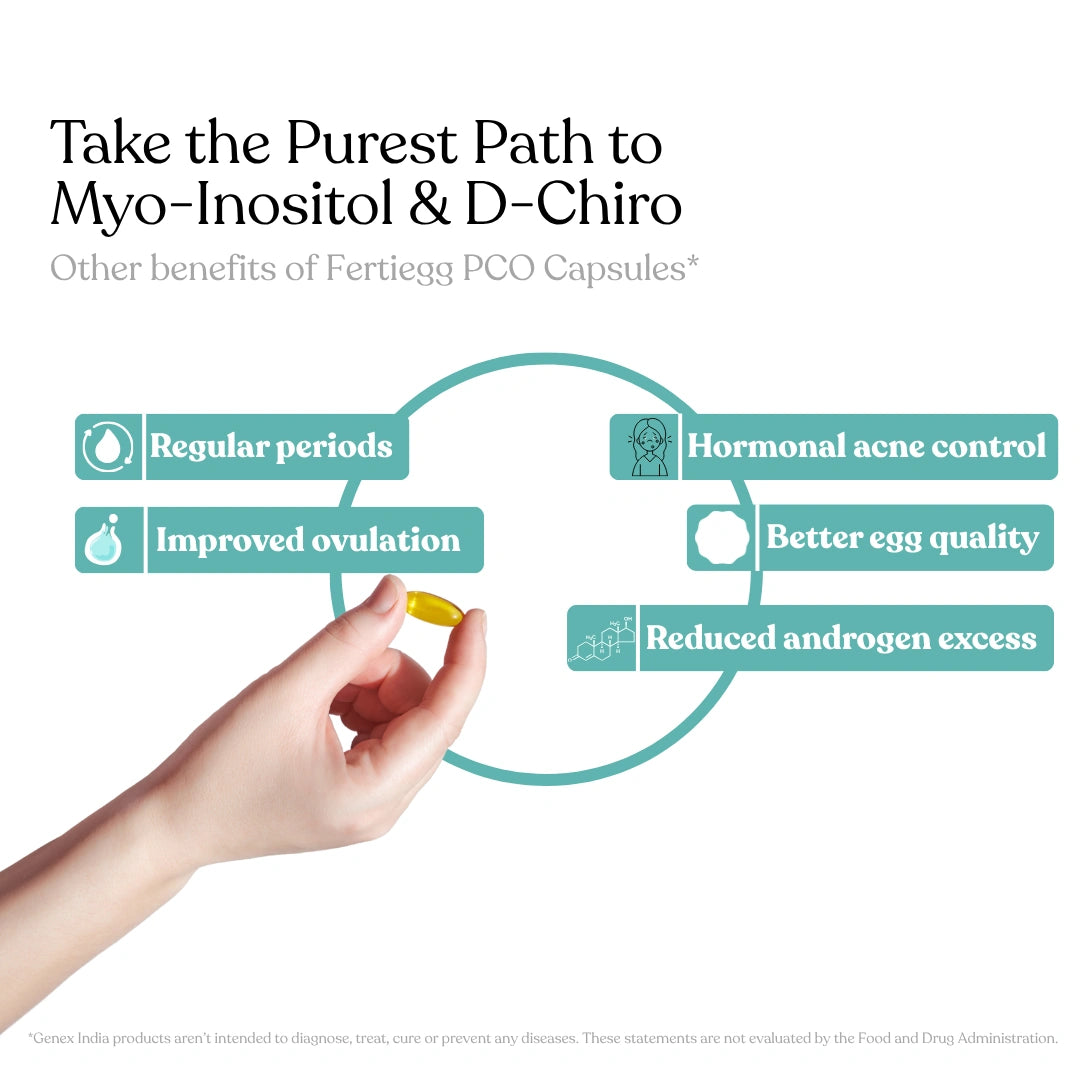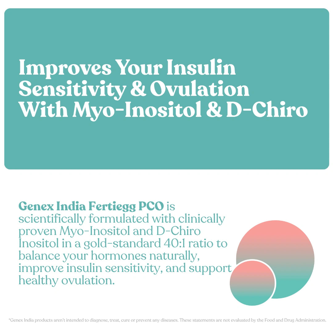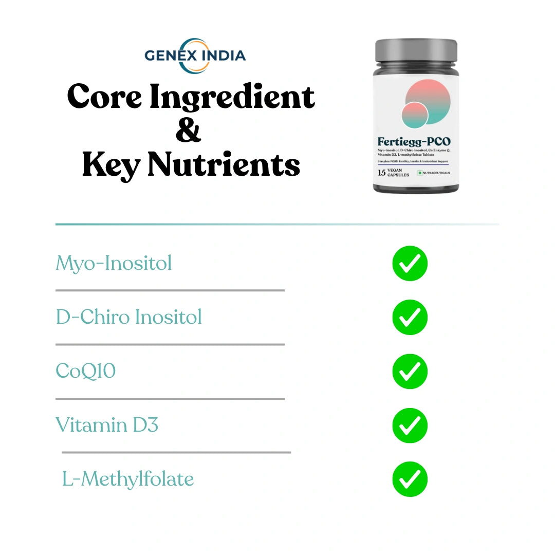 Fertiegg PCO is a doctor-formulated nutraceutical designed to correct insulin resistance, restore ovulation, and harmonize hormones using a powerful blend of Myo-Inositol (1100 mg), D-Chiro Inositol (27.6 mg), Coenzyme Q10 (150 mg), Vitamin D3 (600 IU), and L-Methylfolate (400 µg).